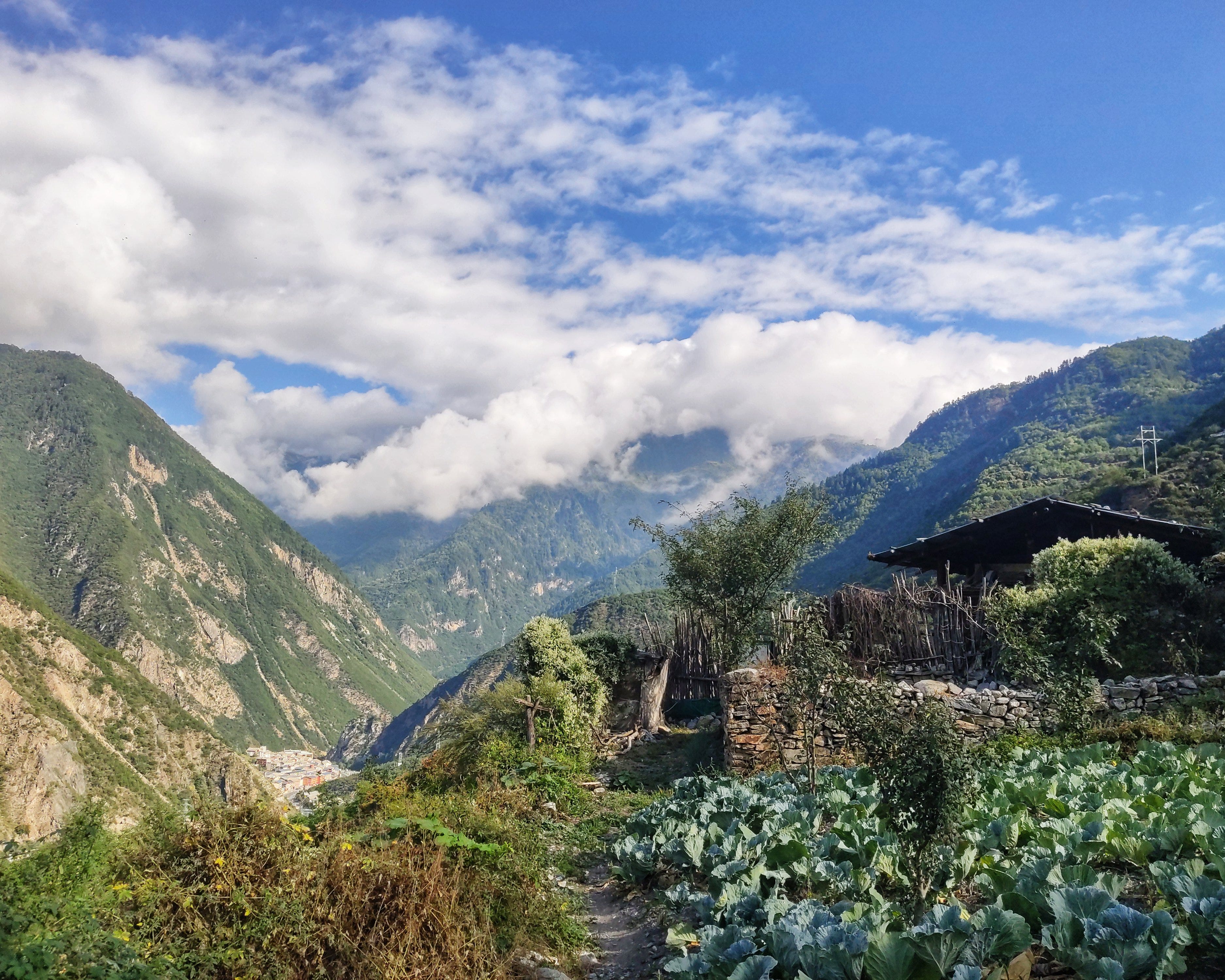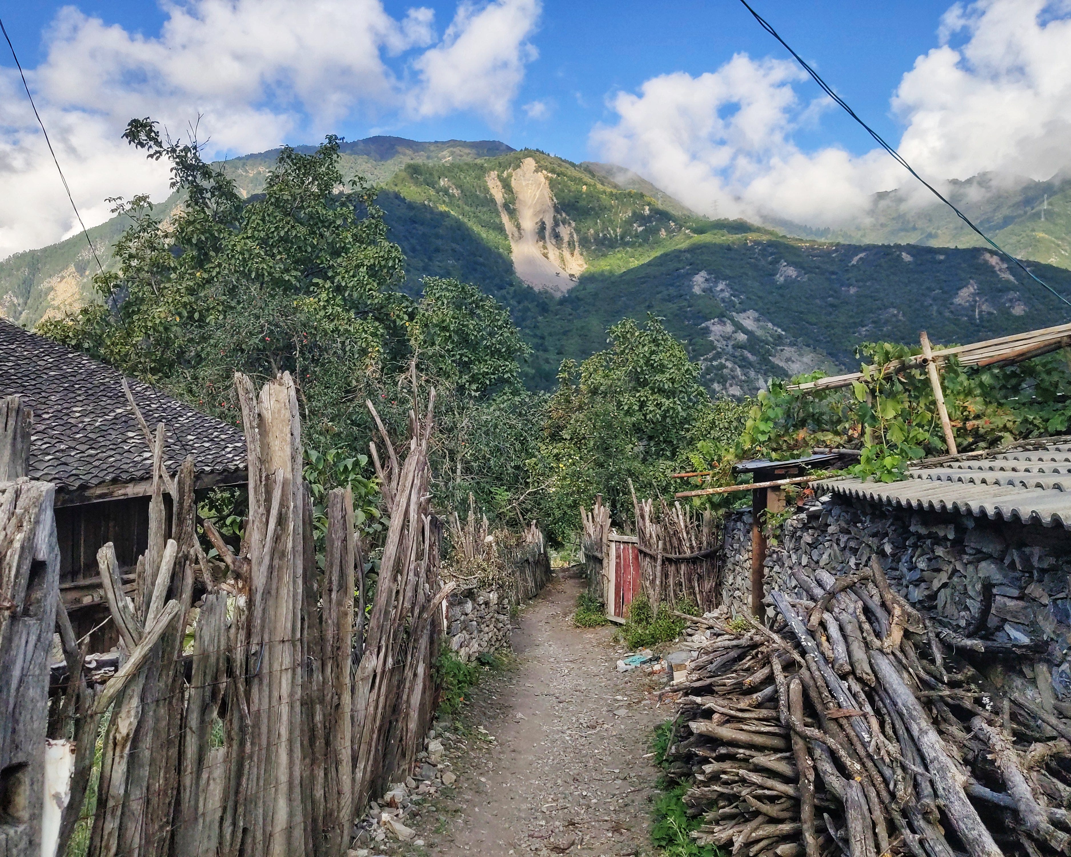 I left them to their work and continued on the uphill path through the hamlet as their voices faded out behind me. Within a few minutes, I had passed the last house and was looking down at the hamlet, the valley below, and the mountains across the valley.