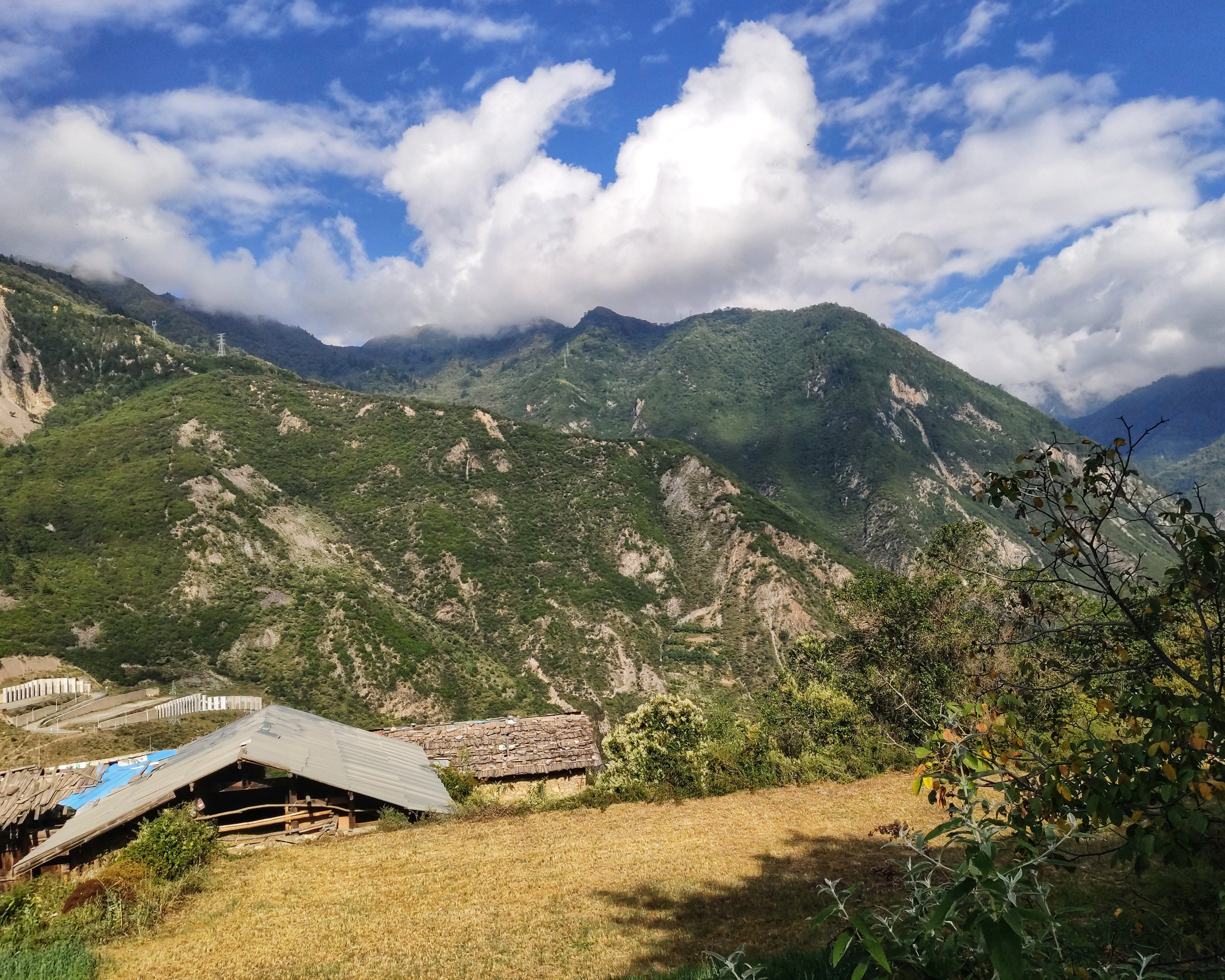 Up behind the village was a small religious area, a grove of trees covered with prayer flags flapping in the morning breeze with a small Buddhist shrine (chorten) made of rock. I continued hiking uphill another 30 minutes, with frequent pauses to catch my breath...