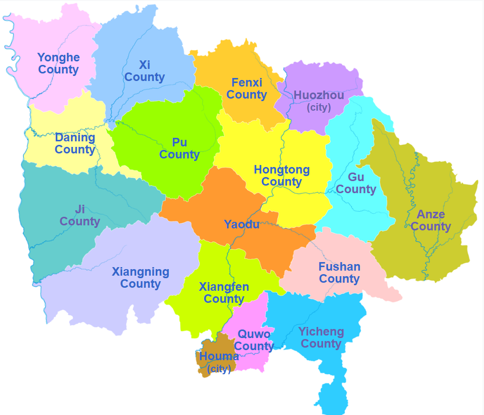 Hukou Waterfall is in Ji County 吉县 and Xiaoxitian is in Xi County 隰县, technically administered by Linfen but both 100+km from the city center.