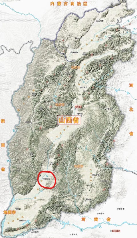 Linfen is an ancient city - and perhaps was even one of the first capitals of China (if you subscribe to the popular legend that the mythical Emperor Yao located his capital here in prehistoric times). In modern times, however, Linfen’s stature is a little more modest. With a downtown population of 1m and a total administrative population of 4m, Linfen is neither large nor small, neither rich nor poor. Linfen comprises a fairly large chunk of real estate. Like all Chinese prefecture-level cities, it encompasses both an urban downtown area (“Linfen proper”, which in this case is just Yaodu District) plus many distant satellite counties and cities.1 Thanks to its mountainous terrain, traveling from its northwest tip in Yonghe County to its southeast extremity in Yicheng County is a 300 kilometer drive requiring 3+ hours.