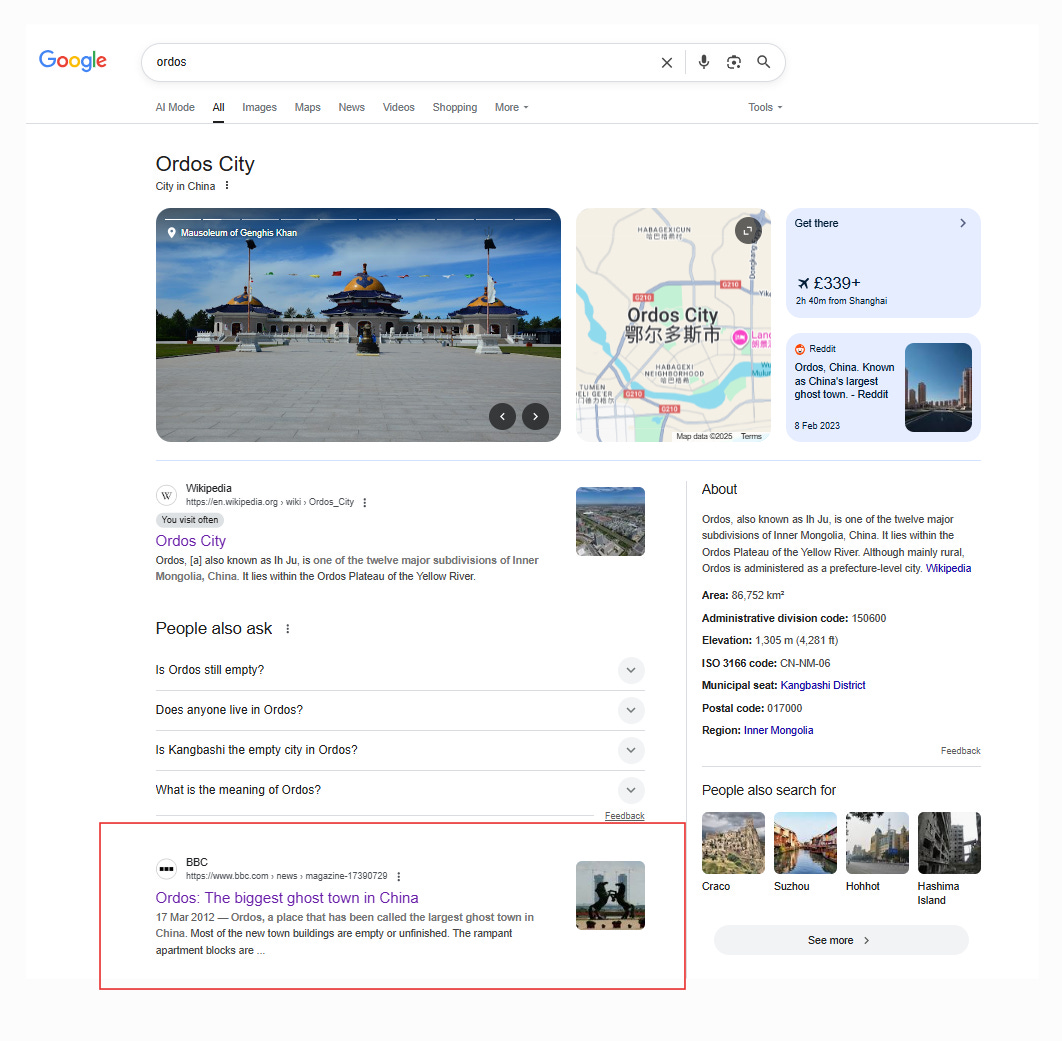 But even today in 2025, the ghost city reputation persists, and it’s still hard to avoid encountering misinformation when looking for up-to-date information about the city. if you Google “Ordos”, the #2 result after Wikipedia is a BBC article from 2012 (13 years ago!) describing Ordos as “the biggest ghost town in China”.