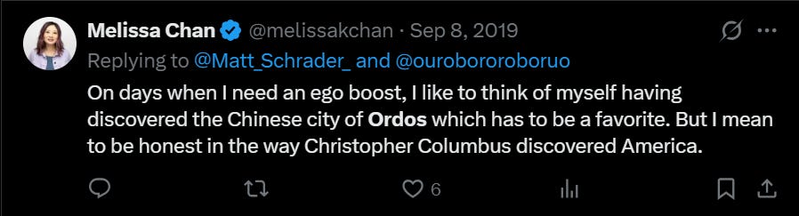 Meanwhile, Chan has never acknowledged how badly she messed the story up…not just the specfic details on Ordos but for missing the opportunity to more thoughtfully examine China’s entire “build it and they will come” approach to urban infrastructure. I normally wouldn’t care much about poor reporting on China, since it usually has so little true effect beyond slightly sweetening the sour grapes of those who need an excuse to disparage what they can’t have. But the Ordos case has had uniquely deep and broad reverberations - both domestically and abroad. Chan’s reporting may have initially just been about sweetening sour grapes - but in the end those grapes turned to vinegar and that vinegar poisoned the narrative well around Chinese urban and infrastructure development strategy, even to this day. As recently as 2019, she was still bragging on Twitter about her work on Ordos, so it seems unlikely any acknowledgement or atonement is forthcoming.